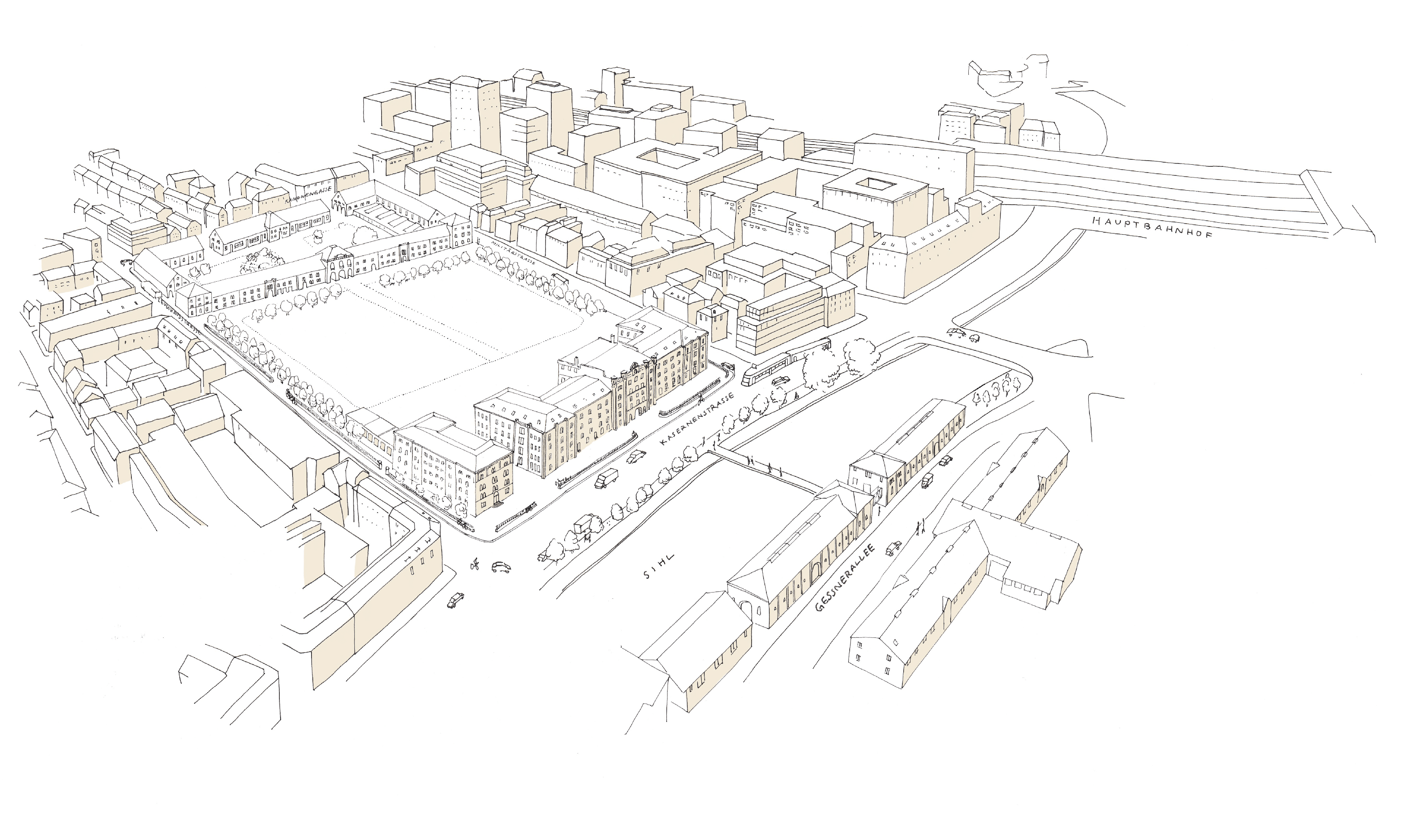 Die Zürcher Kasernenanlage entstand in den Jahren 1864–1876 nach einem von Staatsbauinspektor Johann Caspar Wolff (1818–1891) verfassten Generalplan. In der Tradition einer barocken Schlossanlage ordnete er die Stallungen, das Kasernen-Hauptgebäude, die Exerzierwiese und die Zeughäuser als gestaffelte parallele Baukörper an. Die Anlage ist auf der Tiefe von fast einem halben Kilometer auf eine gemeinsame Mittelachse ausgerichtet und überspannt die Sihl. Erst wenige Jahrzehnte früher war die Stadt mit dem Rückbau der Schanzen der Stadtbefestigung geöffnet worden. Das Kasernenareal überwand die alte Stadtgrenze der Sihl und schlug eine städtebaulich entscheidende Brücke nach Aussersihl.